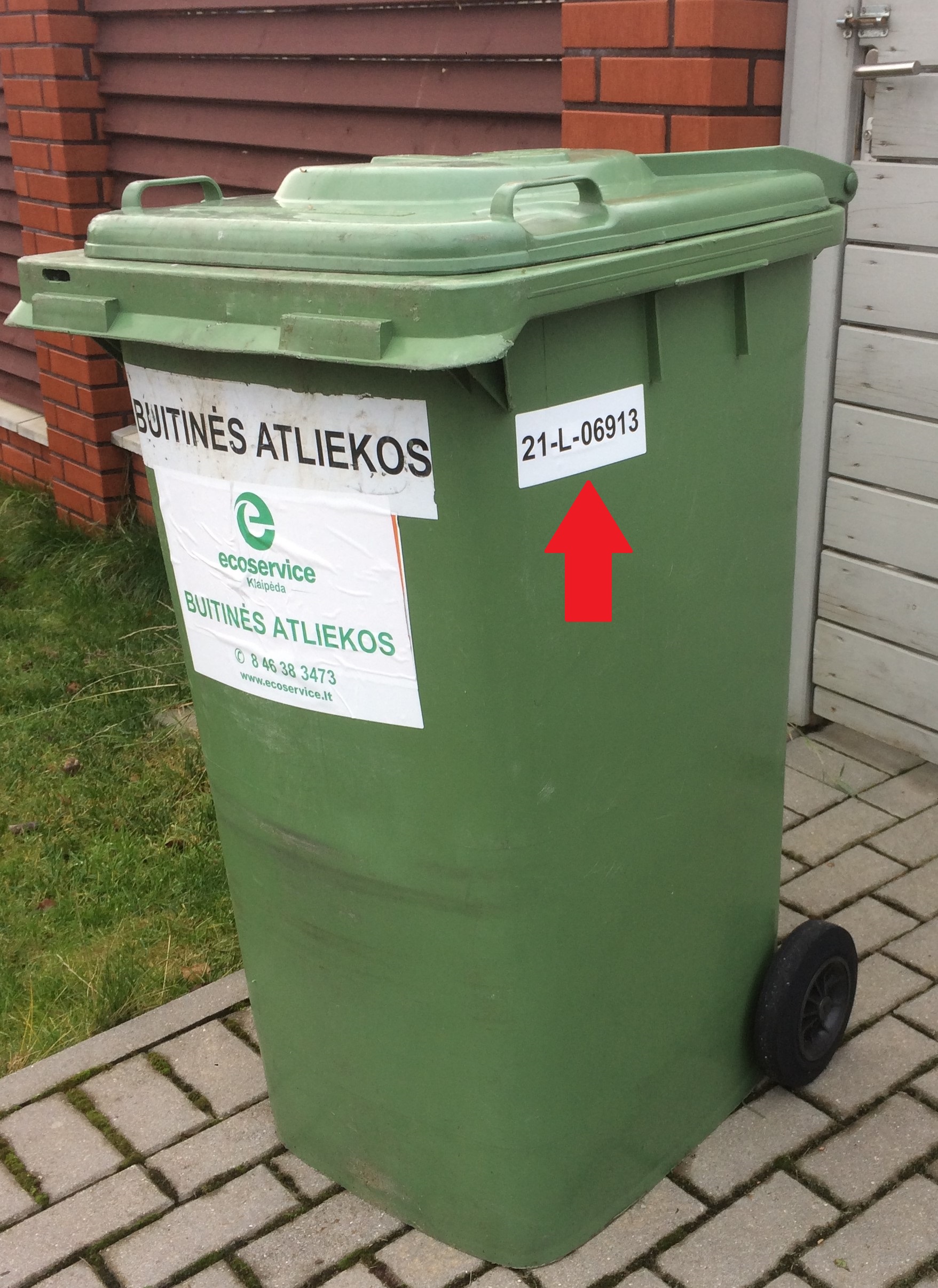 Dėmesio, jeigu ant konteinerio šono (žr. nuotrauką) nėra lipduko su skaičiais – jis dar nepaženklintas.